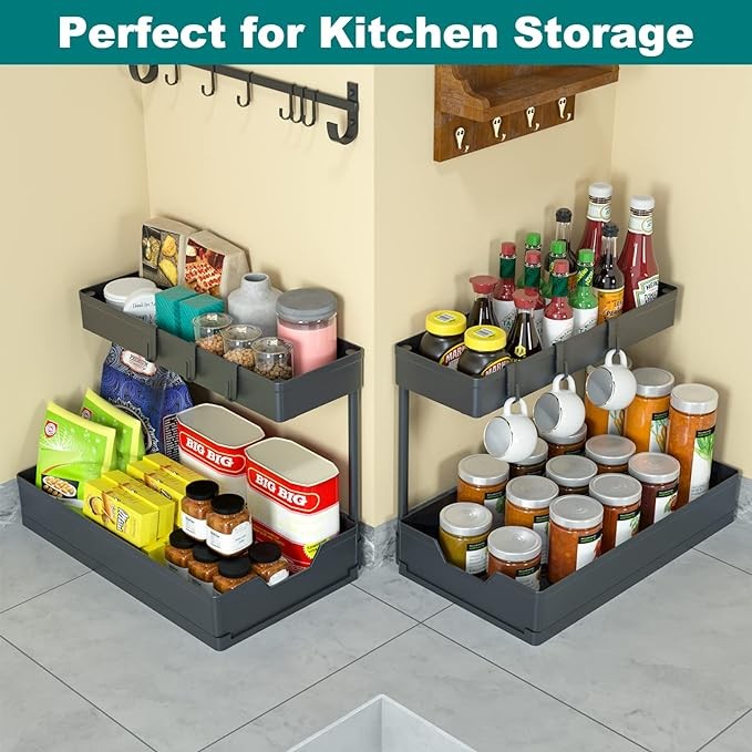 • Space Saving & Neatly Organized This under sliding cabinet organizer can make full use of the cabinet space, like kitchen under sink for cleaning supplies, bathroom under sink for toiletries and so on; With pull out cabinet organizer, you have room for all your stuff, and a slide-out system like this makes it easier to access everything you store under the sink