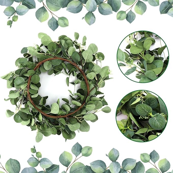 • Brighten up your house: the 20 inch hanging wreath is beautifully crafted with artificial eucalyptus for an elegant modern farmhouse look, looks lifelike, can always keep fresh and stay in green for a long time, you can use it to decorate home, parties, carnival, living room, bedroom, office, home, wedding, or other important festivals, which will create a pleasant atmosphere for these places