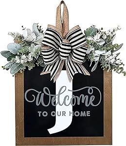 2024 New Last Name Year Round Front Door Wreath Front Porch Decoration 26 Letter Welcome Sign with Eucalyptus Garland and Bow Spring Wreaths for Front Door Outside Hanger Garland (J)