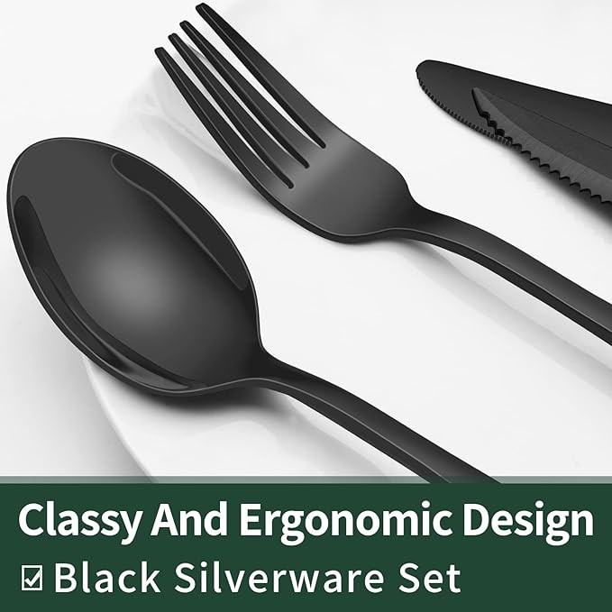• COMFORTABLE DESIGN: This flatware set has a classic silhouette with clean lines and polish-finish surface in all black, a good choice to go with your existing tableware. The smooth edge of the handle is pleasure to hold, appropriate weight and perfect balance are added to ensure maximum comfort during use.