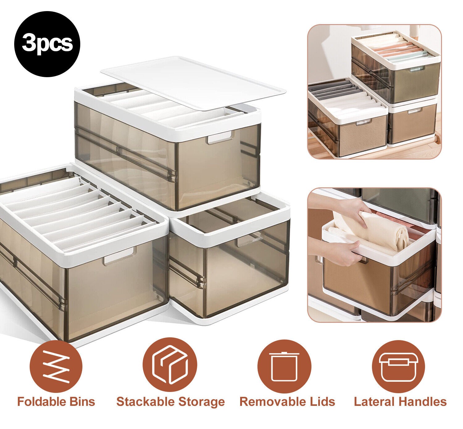 3 Packs Collapsible Storage Bins Wardrobe Closet Organizer Container With Lid