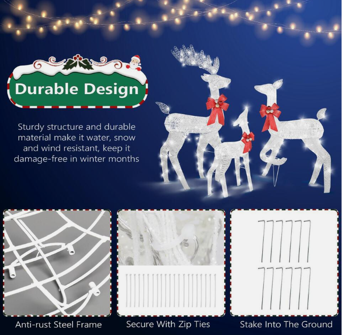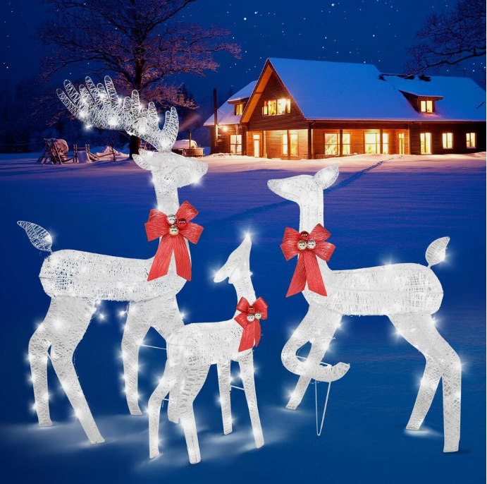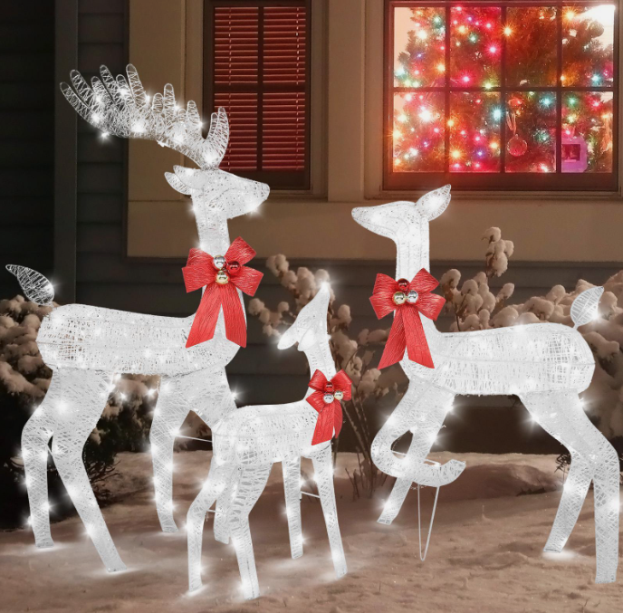 Christmas is coming, give your home a warm Christmas atmosphere! Don't you know how to match it for Christmas? Recommend this 54*38*122cm Family Elk Golden Iron Frame Cotton Thread Green Onion Powder Courtyard Elk Decoration to you here! It is composed of three elks, which were beautiful and fun. It is made of high-quality materials, strong and durable, and its beautiful appearance is better at night. And it can be used repeatedly, so what are you waiting for? Hurry up and place an order!