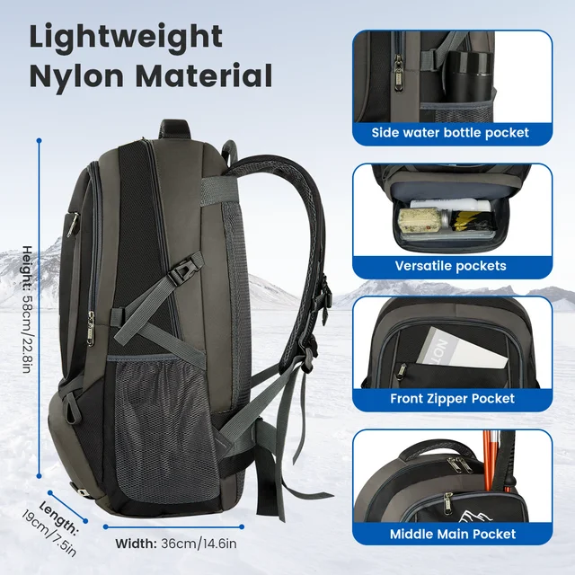 Hiking backpack provides several pockets for handy storage and convenient organization. Spacious backpack packed with roomy zipper main compartment, 1 pouches with large capacity, 1 shoes compartment and 2 mesh side pockets. In addition, the bottom of the backpack is equipped with fixing straps to neatly pack and transport your sleeping bag.