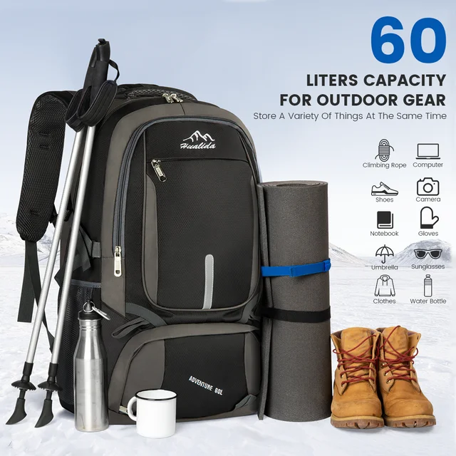 60L Hiking Backpack with Shoes Compartment, Lightweight Travel Daypack, Waterproof & Tear Resistant, Outdoor Sport Large Capacity Rucksack for Men Women Climbing, Camping, Touring, Hiking, Travel