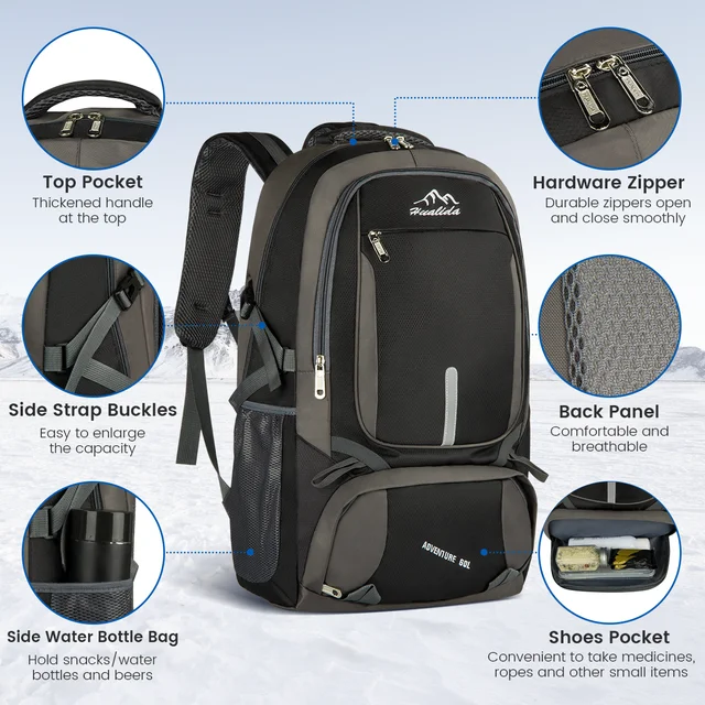The 60L hiking backpack is lightweight, only 2.8lbs, designed for minimalist hikers with first-class durability and comfort. It’s breathable mesh shoulder straps with plentiful sponge padding help to relieve the stress from your shoulder.