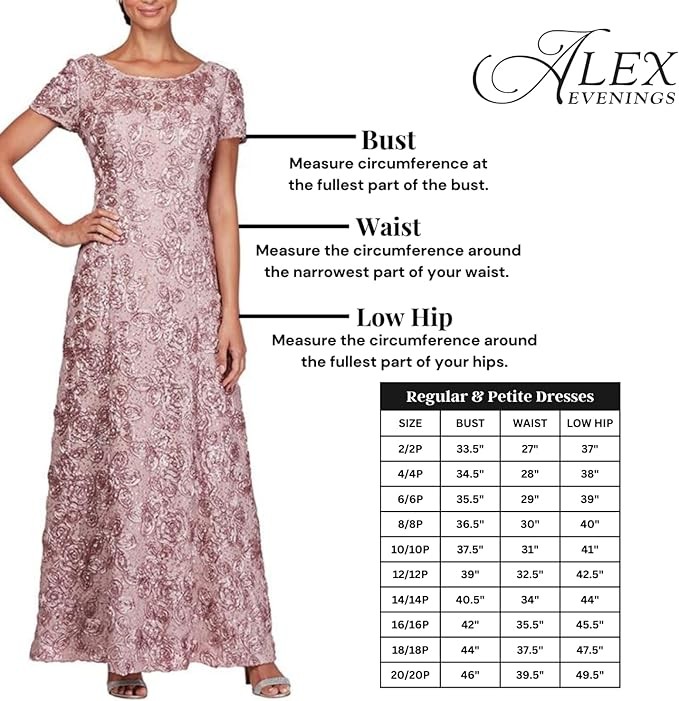 • Sizes for Every Woman: At Alex Evenings, we embrace the beauty of every woman. Our inclusive sizing, from Petite to Regular, and Plus sizes, ensures that our dresses are designed to complement various body types. Find your perfect fit for any special occasion.