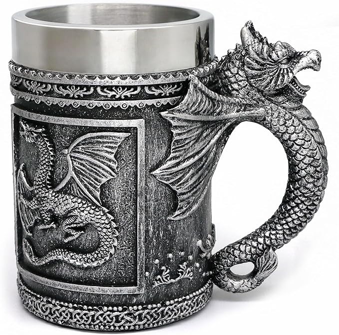 • COOL DESIGN - Double-sided 3D three-dimensional flying dragon roaring design, retro silver and pattern engraved details, make the whole more exquisite and domineering. The handle adopts a unique thickened dragon body design, engraved with realistic dragon scales, making it easier to hold and support the cup when drinking.