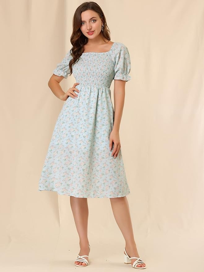 Allegra K Women's Square Neck Puff Sleeves Casual Midi Smocked Floral Dress