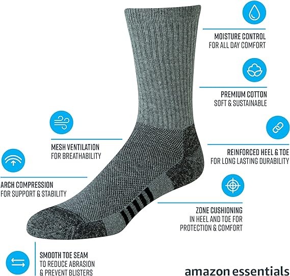 • MATERIAL: Amazon Essentials socks are made from high-quality and durable materials. These socks are a cotton-poly blend with elastane for superior fit and shape retention.
