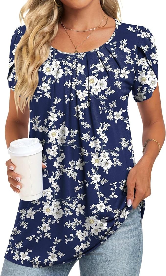 Anymeet Women's Tops 2024 Summer Tunic Short Petal Sleeve Casual Shirts Pleated Blouses for Leggings