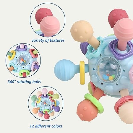 • [ Muti-Sensory Baby Toys ] - This atomic-shaped teether & rattle toys features 12 different colored and textured chew points to calm little ones during teething, and alleviate discomfort caused by gum pain