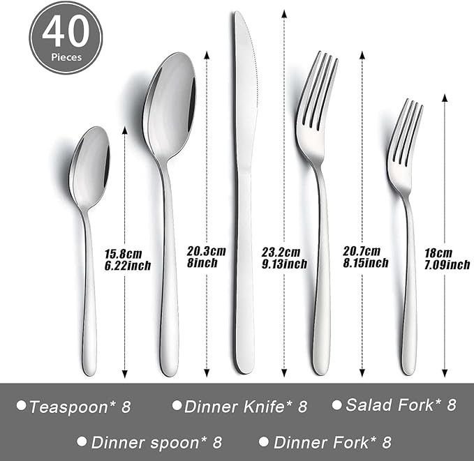 • ✅【Economical and Practical】40 piece economical silverware set for 8 will be a cost-effective solution for your mysteriously disappearing flatware in daily life, which contains 8 dinner knives, 8 dinner forks, 8 dinner spoons, 8 salad forks and 8 teaspoons.