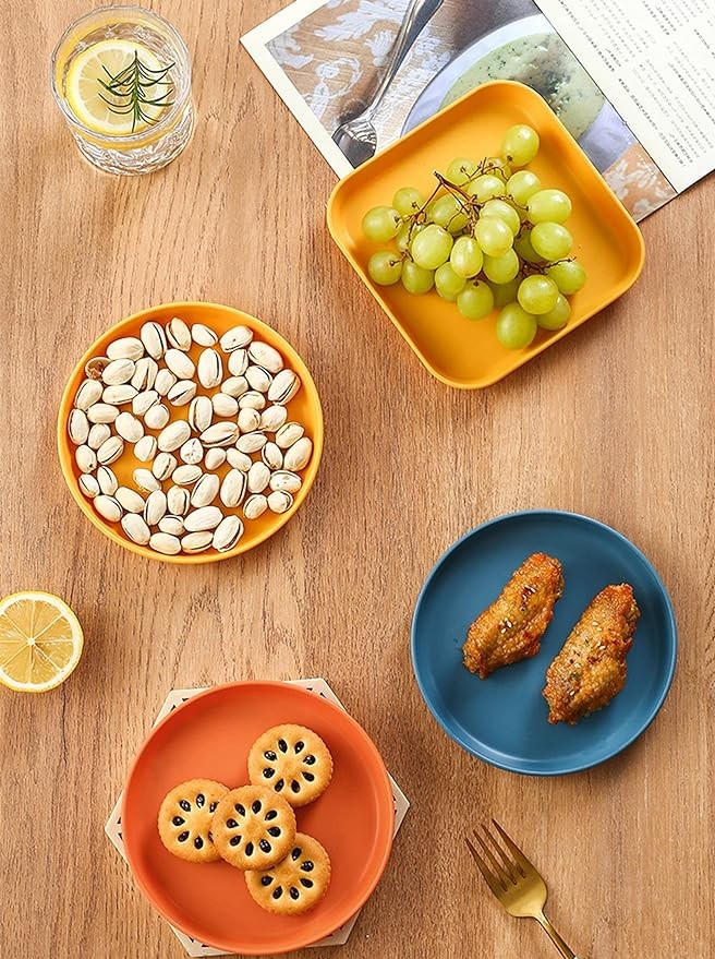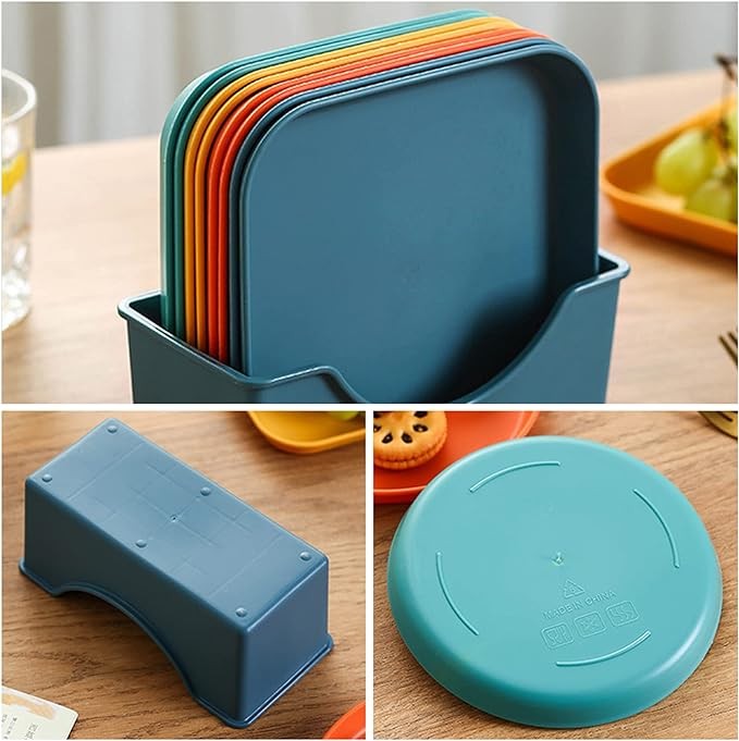 • FUNCTIONAL DESIGN:8 pcs plates can be placed in one base,This fruit plate is lightweight and easy to store. Rounded corners, one-piece molding, no burrs, no hand injury.Heighten the bottom of the plate, reduce wear and tear, and place it firmly.Can be stacked at will, convenient for storage and saving space.Bright colors can be used to decorate your house.