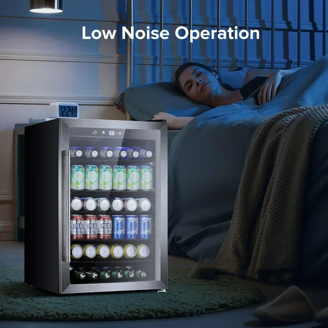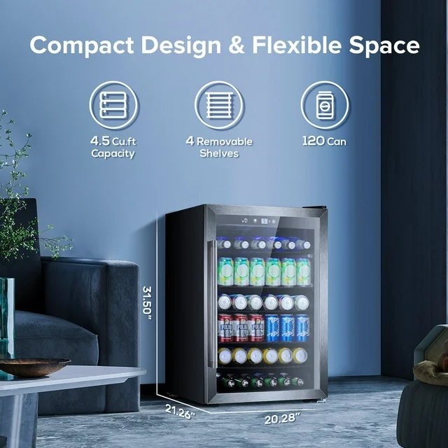 • COMPACT BEVERAGE COOLER: 20.5*21.3*31.4 inches mini refrigerator can keep a variety of canned drinks or wine chilled without taking up too much space at your home, dorm, bar, or office. It can conveniently hold 145 standard-sized drinks cans to impress your guests during parties, and this high-quality Beverage Refrigerator will surely fit and add an elegant accent to any home decor.