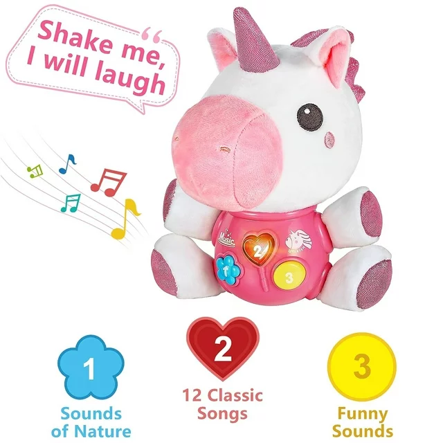 Looking for the ideal baby shower, Christmas, or birthday gift? Look no further than this musical unicorn! It's an excellent toy for babies aged 0-3-6-12 months. Baby girl toys 0-6 months, baby girl gifts musical toys for new baby, newborn toys 0-3 months. Our soft plush stuffed animal toy features three buttons that play 12 classic songs, nature sounds, and 6 funny sounds. The red heart on the toy lights up with the sounds, creating a captivating visual experience for your little one. Baby toys 6-12 months. Our unicorn music infant toys are made of high-quality ABS materials & skin-friendly plush fabric. While engaging with the soft plush stuffed animal toy, your baby will develop sound cognition abilities, fostering brain development, creativity, and imagination. Baby toys for 12-24 months. The soft, light-up musical unicorn also helps soothe babies, promoting peaceful sleep throughout the night. The soft plush stuffed animal toy is perfect for tummy play time or travel, allowing your little one to release their boundless energy.