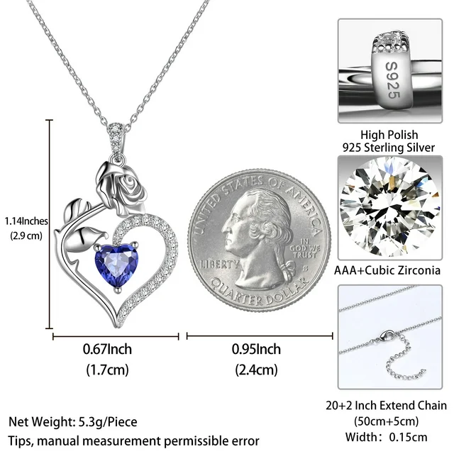 925 Sterling Silver Heart Rose Birthstone Necklace Fine Jewelry Mother's Day Anniversary Birthday Christmas Gifts for Women Girls Female