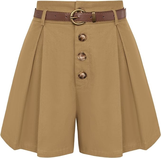 Belle Poque Womens Shorts Dressy Casual High Waisted Summer Pleated Wide Leg Shorts with Pockets and Belt