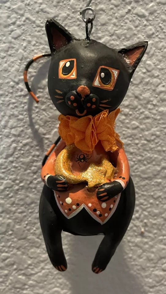 This discontinued Leeann Kress for Bethany Lowe Halloween Moon & Stars Cat ornament is brand new. It has never been used or displayed and was unwrapped for these photos only. It has its original tag.