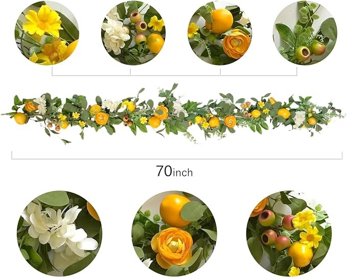 • 1. Abundant Lemon Garland: The 66 inch spring wreath boasts a lush greenery base, beautifully embellished with an abundance of elements including yellow lemons, berries, spring flowers and more. These elements are expertly arranged on a natural rattan base, creating a vibrant scene.