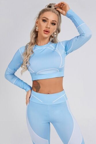 Blue 2 Piece Long Sleeve Fitted Graphic Yoga Gym Work Out Set For Women