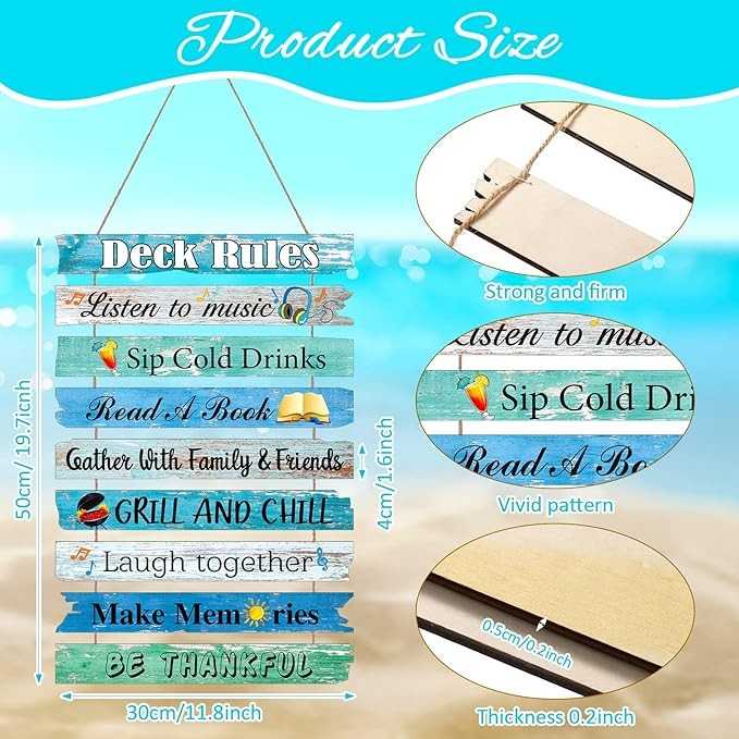 Package Includes: 1 piece of the deck decor, and the size of this wooden deck rules wall decor is approx. 50 x 30 x 0.5 cm/ 20 x 12 x 0.2 inch after hanging, making our deck rules sign decor too small or too, suitable for decorating your home, bedroom, kitchen, office and so on