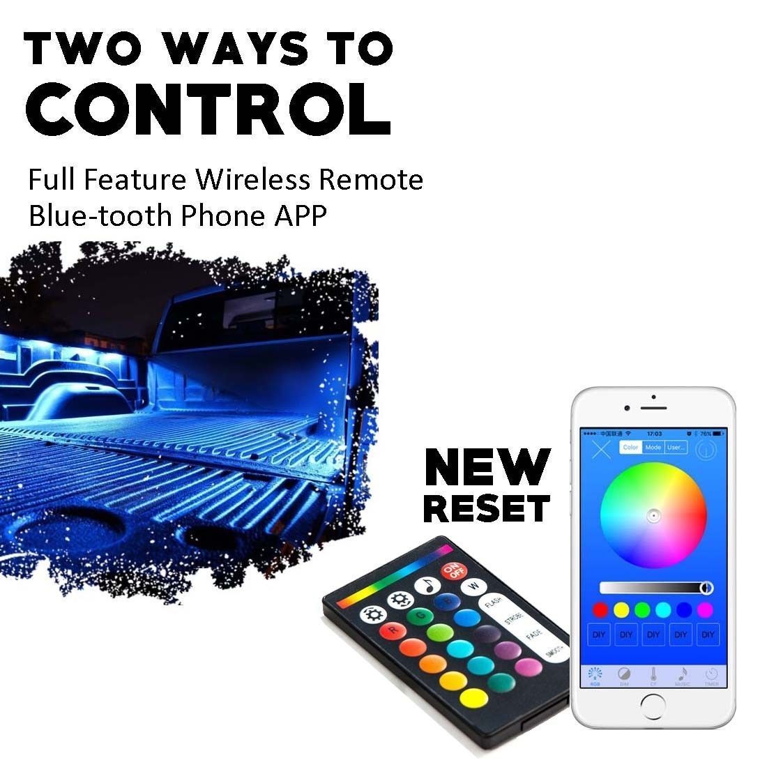 Two Ways to Control,Bluetooth Phone app + Remote, Music Active,Sync light to Music, High Power 3-in-1 LED,give you more, Brake Light Feature,red color when brake active, Easy Power switch cable, Plug and Play,easy install, Fit for any 5-24V ride, Come with 8 Pods,6 LEDs each pod