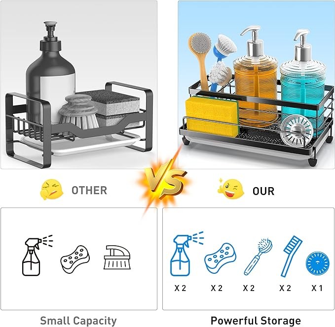 【MORE STORAGE SPACE 】Compared to other kitchen sink caddy CISILY sponge holder expands to 5.3 inches wide and 9.49 inches long, enhancing its kitchen organization function, and allowing flexible placement of sponges, dish soap, soap dispensers, brushes, sink plugs and more. Make the most of every inch of space and make your kitchen look cleaner.