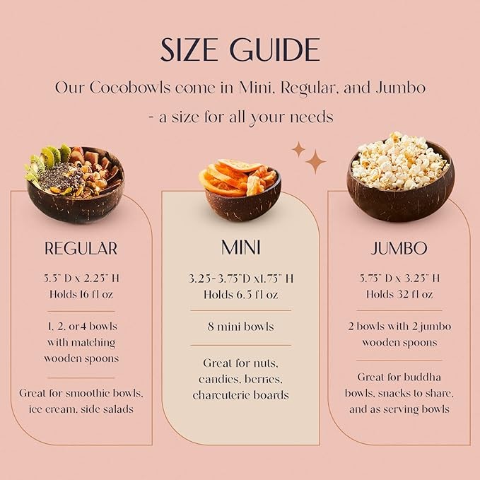 • Each set included 4 Polished, and 4 Natural Finished Mini Bowls. Sizes will range due to the fact that these are hand crafted from REAL Coconut Shells. Width = 3.25 in. - 3.75 in. Height ≈ 1.75 in. Volume ≈ 6.5 fluid ounces.