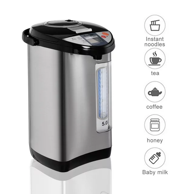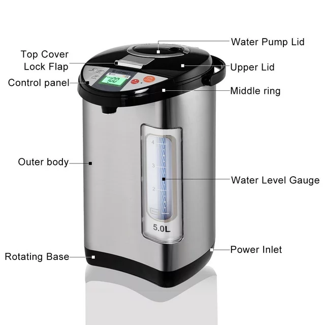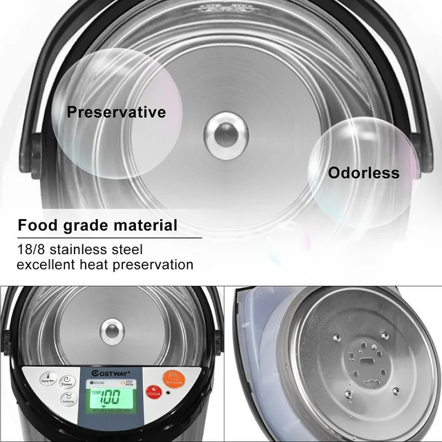 This electric thermo pot uses food grade 18/8 stainless steel to make the inner container so that you can rest assured of its safety. It features a LCD display with night light function for easy operation through which you can know the current water temperature and the display shows five stages of temperature(including 40, 50, 60, 85,98 degree C). This hot water dispenser is equipped with 3 different water dispensing methods:Air pump water outlet & Dispense water outlet & Cup water outlet. It's worth mentioning that the first one can be operated without power. It has a re-boil function to quickly bring water back to boiling. And the timer function allows water to be heated to the temperature desired at the perfect time when needed. The electric thermo pot will bring you a more comfortable and healthy life.