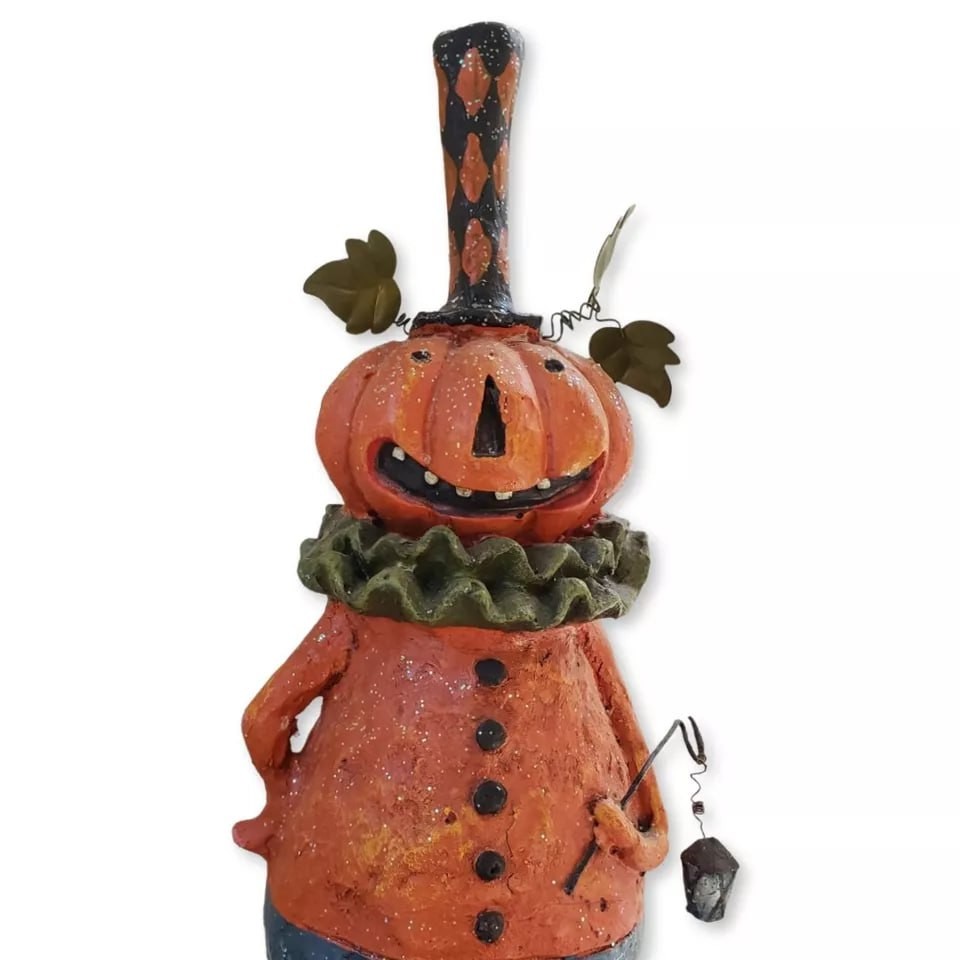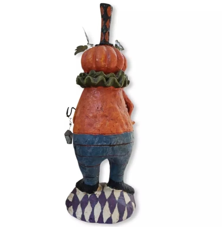 This is a CJF Folk Art grinning Jack O' Lantern Halloween figure.   His glittery outfit is accented by his ruffled circus clown collar and his VERY tall top hat.  A tiny little lantern hangs by his side.  He measures approximately 22" tall, 8 1/2" wide and 6 1/4" deep.  He's in very nice condition.  There are a few scuffs but are not very noticeable because of his design.
