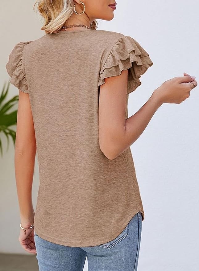 Dokotoo Women's Casual Ruffle Short Sleeve Tops Cute Solid Color Knit Ribbed T Shirts Blouses