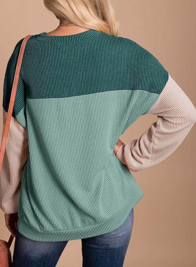 Dokotoo Womens Fashion 2024 Color Block Long Sleeve Crewneck Knitted Casual Loose Pullover Shirts Tops