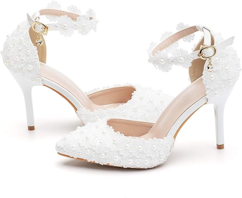 Dress First Women's High Heel Pumps Closed Toe Sandals with Floral Lace Pearls Strap Stiletto Bridal Wedding Party Shoes,3.74"