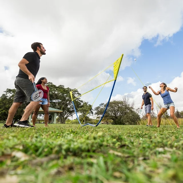• Set includes one Fast Setup net and pole system, 1.25 in (3.18 cm), 4 official size badminton rackets, 2 white shuttlecocks, 8 ground stakes, 2 guide ropes, and one convenient carry bag