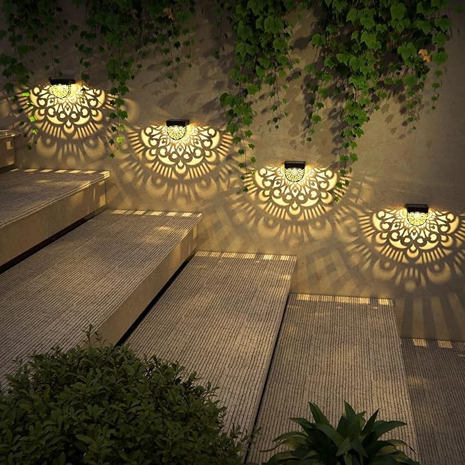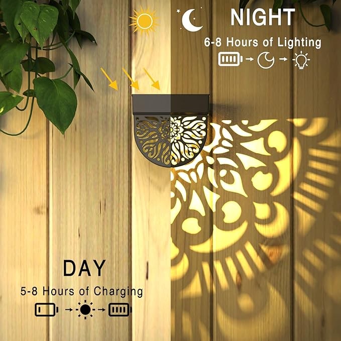 • ?【Beautiful Decoration】10 lumens of warm yellow light. The fence solar lights can project a unique and beautiful mandala and moon pattern. In a dim environment, the solar lights can illuminate a corner of the fence or the wall and create a beautiful and warm atmosphere. They are very suitable as holiday decorations and gifts for relatives and friends.