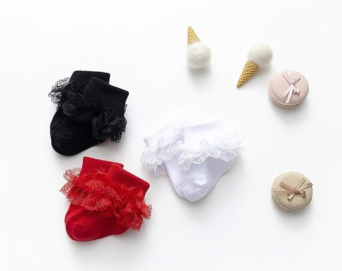 • Turn Cuff,Unique Triple Frilly Lace Socks Super Cute for Dress up,or Everyday Wear.Made of a Cotton and Spandex blend.Soft and Breathable.The Stretch of These are Nice not too Tight and Does Not Over Stretch.