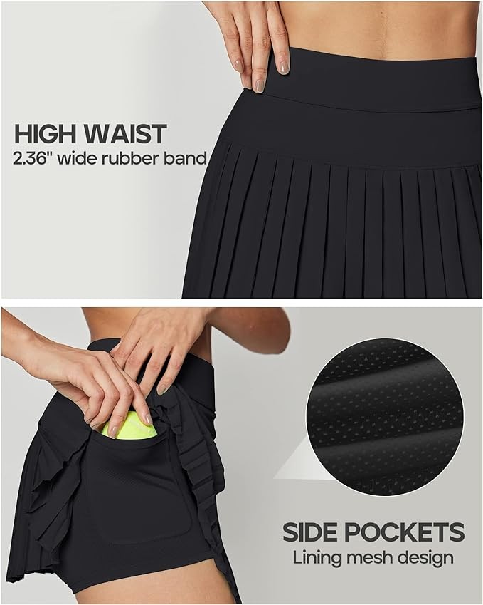 • Feel free to soar in 2-IN-1 skorts skirts for women. This tennis skirts designed for freer, fuller movement, Ewedoos tennis skirt with shorts with built-in shorts for a total coverage and ease of movement, you can reach to return every serve without anything holding you back. Plus, two side pockets are added in undershorts are great for keeping your essentials within reach.