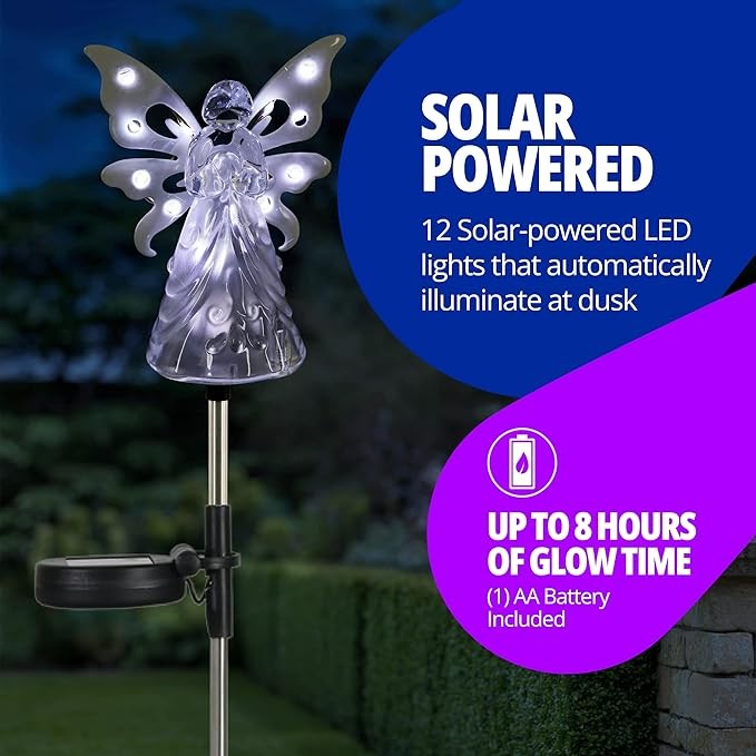 • EVERLASTING GLOW: Our solar garden stake lighting is powered with 12 energy-efficient LED lights to provide breathtaking illumination as the sun sets and dusk settles in; our guardian angel landscaping stakes automatically light up at dusk and are great for adding beautiful accent lighting to your garden plants, patio, porch, yard or path way area **Requires 24 hours of direct sunlight upon first installation**