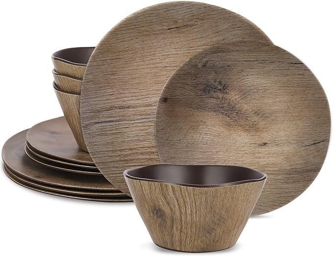 • SERVICE FOR 4: Complete 12 piece melamine dinner set for 4; 4 pcs large 10.5" dinner plates, 4 pcs 8.5" salad or dessert plates, & 4pcs 6" wide x 3" high soup/cereal bowls. Consider complimenting our rustic melamine plastic plates and bowls set dishes with our polished hand-forged flatware. A beautiful addition to your rustic farmhouse kitchen decor and home decor.