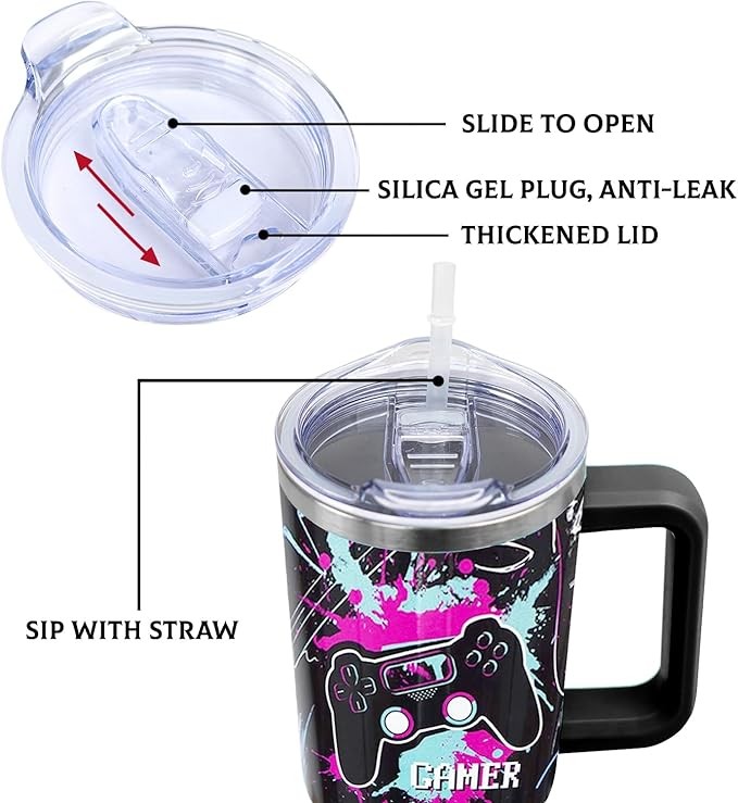 • 40 Oz Tumbler with Handle and Straw: The 40 ounce tumbler with handle has a large 40oz capacity helps you hold more water at once, and is easy to hold. The lower narrowing design of this gamer coffee travel cup tumbler fits most cup holders. These gamer cups are suitable for everyday use, coffee/tea on the go, indoor and outdoor events, travel, parties, camping, Etc.