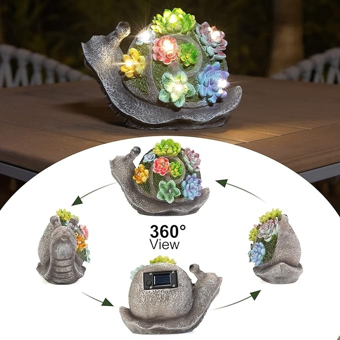 • 【SOLAR SNAILS STATUE】 -- This solar yard decor light completely adopts the solar energy charging method, energy saving and no electricity bills. Perfect decorating the garden, path and other outdoor places, it also looks wonderful on the lawn, in the flowerpot or under the tree. Mainly made for decoration, not for illumination.