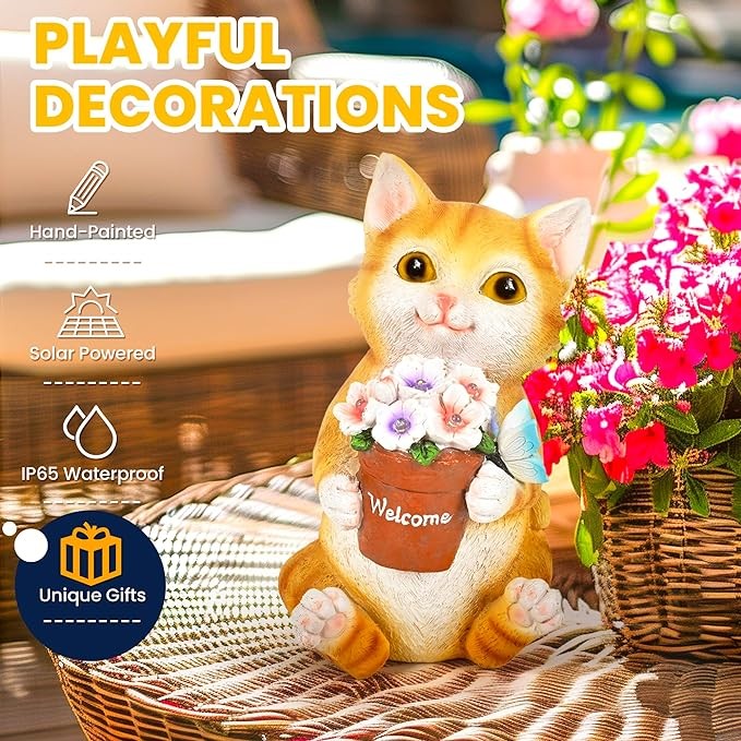 • [Unique Design]: Our garden figurine features an adorably designed cat cradling a welcome-bearing flower pot, complemented by innovative solar lighting that brings the piece to life in the evening.This charming design enlivens your garden and welcomes guests with warmth.