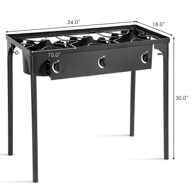This powerful triple burner, equipped with a cast iron head, outputs a whopping BTU of 220000. On holidays, you can invite your friends to have a party outdoors. You can cooperatively use the cooking utensils such as barbecue grills, soup pots, wok, etc. It would must make your party more funny. Do not hesitate, just buy it Note:GAS TANK AND COMAL ARE NOT INCLUDED