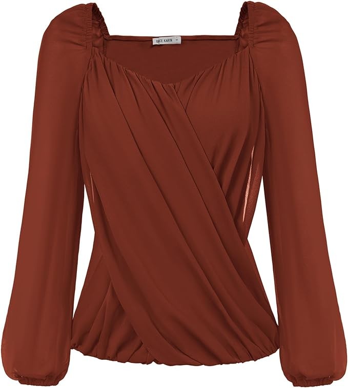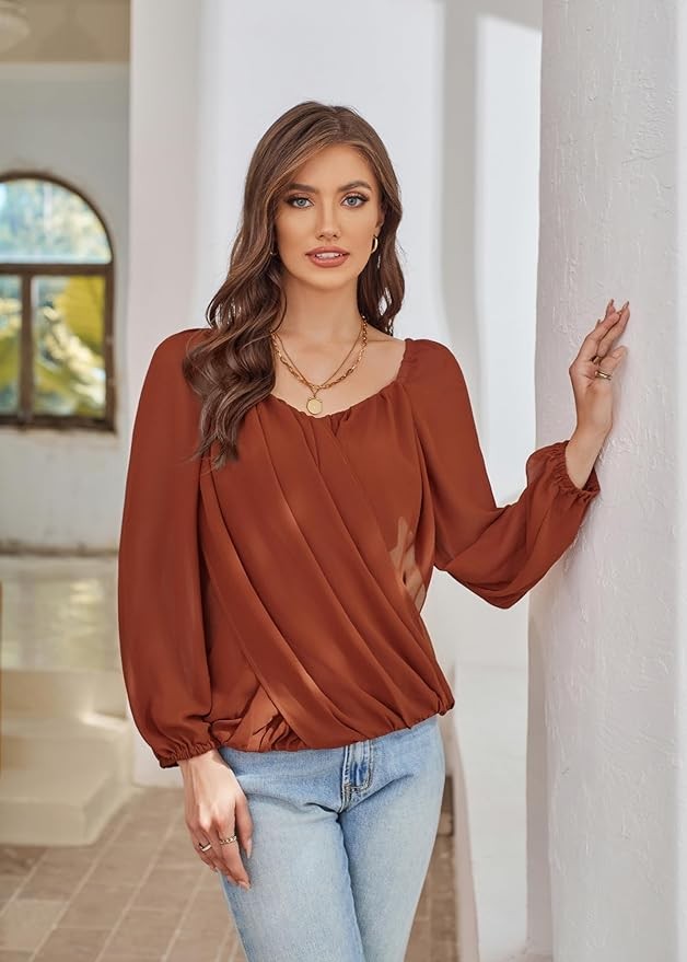 • Features: Chiffon blouses for women, sweatheart neck, pleated front, criss cross design, lantern long sleeve with elastic band, loose fit, flowy style. Every detail is carefully crafted to enhance your style and comfort.