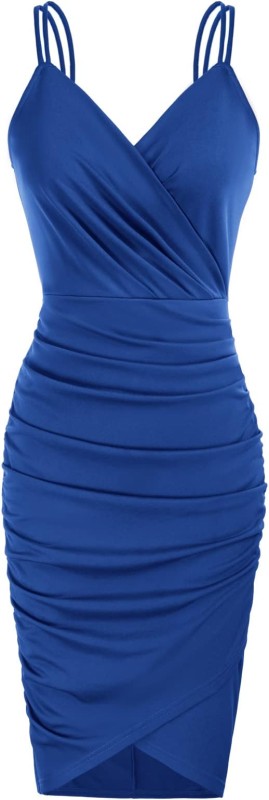 FEATURES: Spaghetti straps design, elastic shoulder straps, surplice V-Neck with hidden button, ruched front, irregular wrap hem, hidden zipper in the back, hits at mid-thigh, slim fit hips-wrapped silhouette, sexy bodycon party midi dress for women.