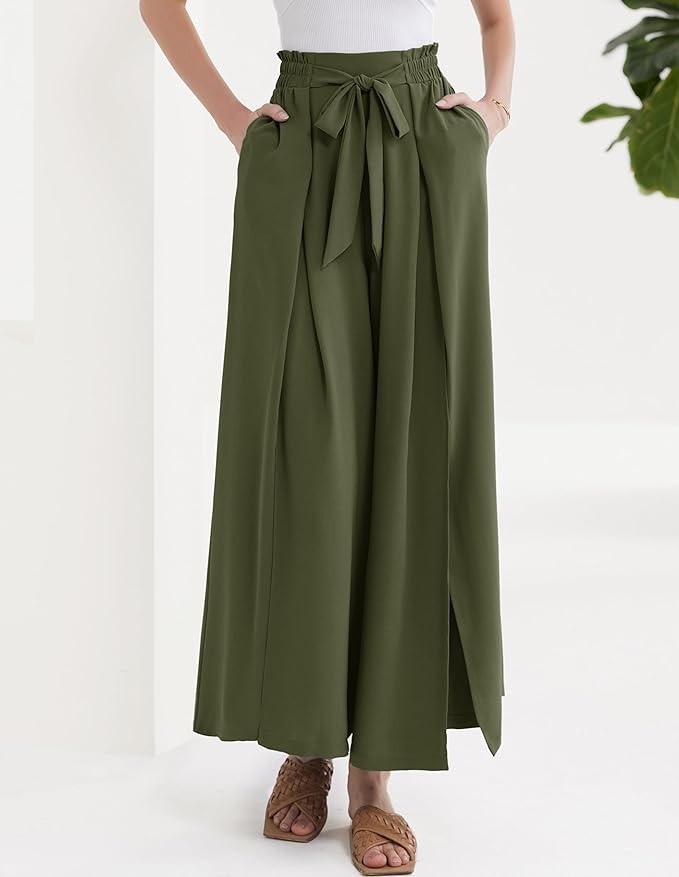 GRACE KARIN Women's Wide Leg Pants with Pockets Lightweight High Waisted Tie Knot Caual Loose Split Flowy Palazzo Trousers