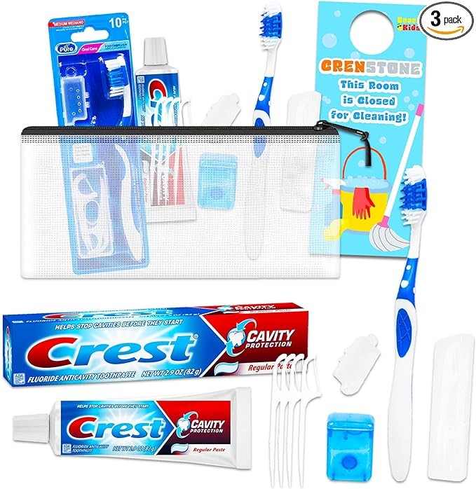 • This travel oral care kit includes a 10 piece travel set, a mini travel bag, and a 2.4 oz Crest anti-cavity toothpaste.