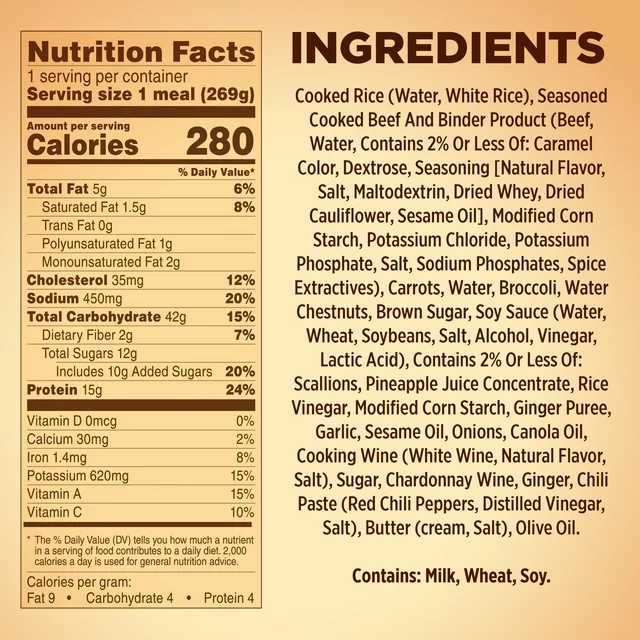 • Tender beef strips with rice carrots, broccoli and water chestnuts in a sweet teriyaki sauce