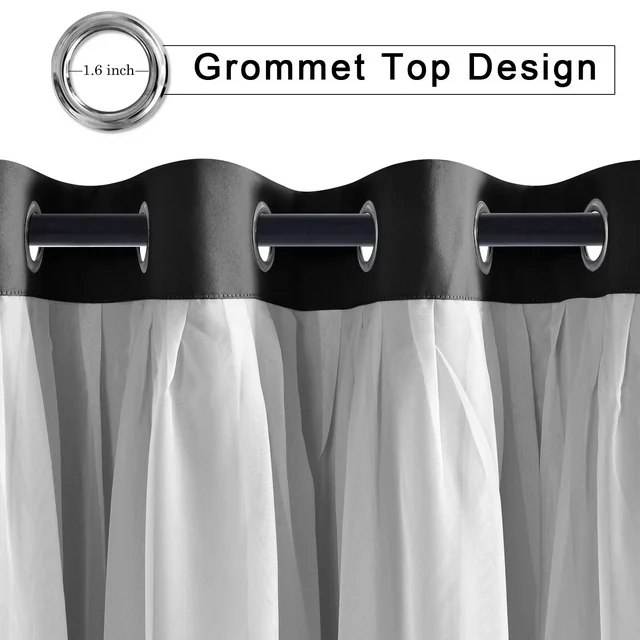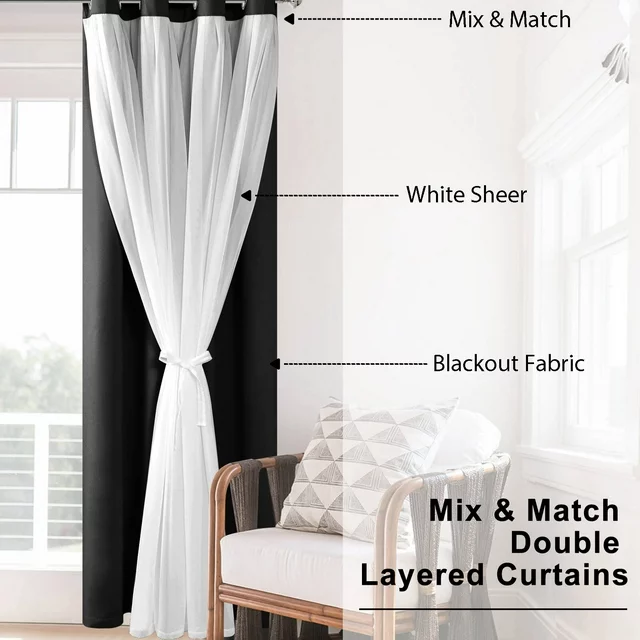 • PREMIUM MATERIAL: Hiasan mix & match blackout curtains with white sheer overlay are crafted with high quality fabric. Great soft and durable curtains are idea for home decor. Each package includes 2 double-layered panels measuring 38"W by 84"L inch.Each panel has 8 silver Grommets (1.6" inner diameter). These light blocking curtains are in combined design, so it is easy to hang and slide on one curtain rod