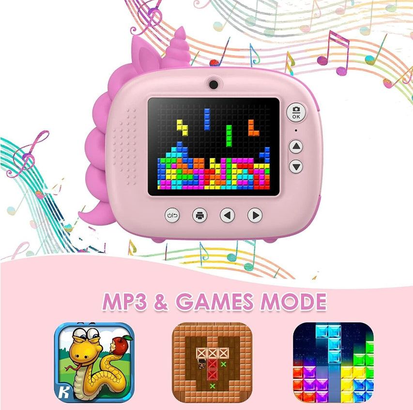 • [MULTIFUNCTIONAL & EASY TO OPERATE] This kids camera has 6 functions, such as colour photography, high-definition video, black & white printing, music, playback and games, which allows your kids to operate easily and have fun. Moreover, In order to help your child better record every meaningful moment of their childhood, the camera also has built-in 6 kinds of colour filters, 20 kinds of cartoon photo frames & characters, etc., and supports continuous shooting, timer shooting and other functions.